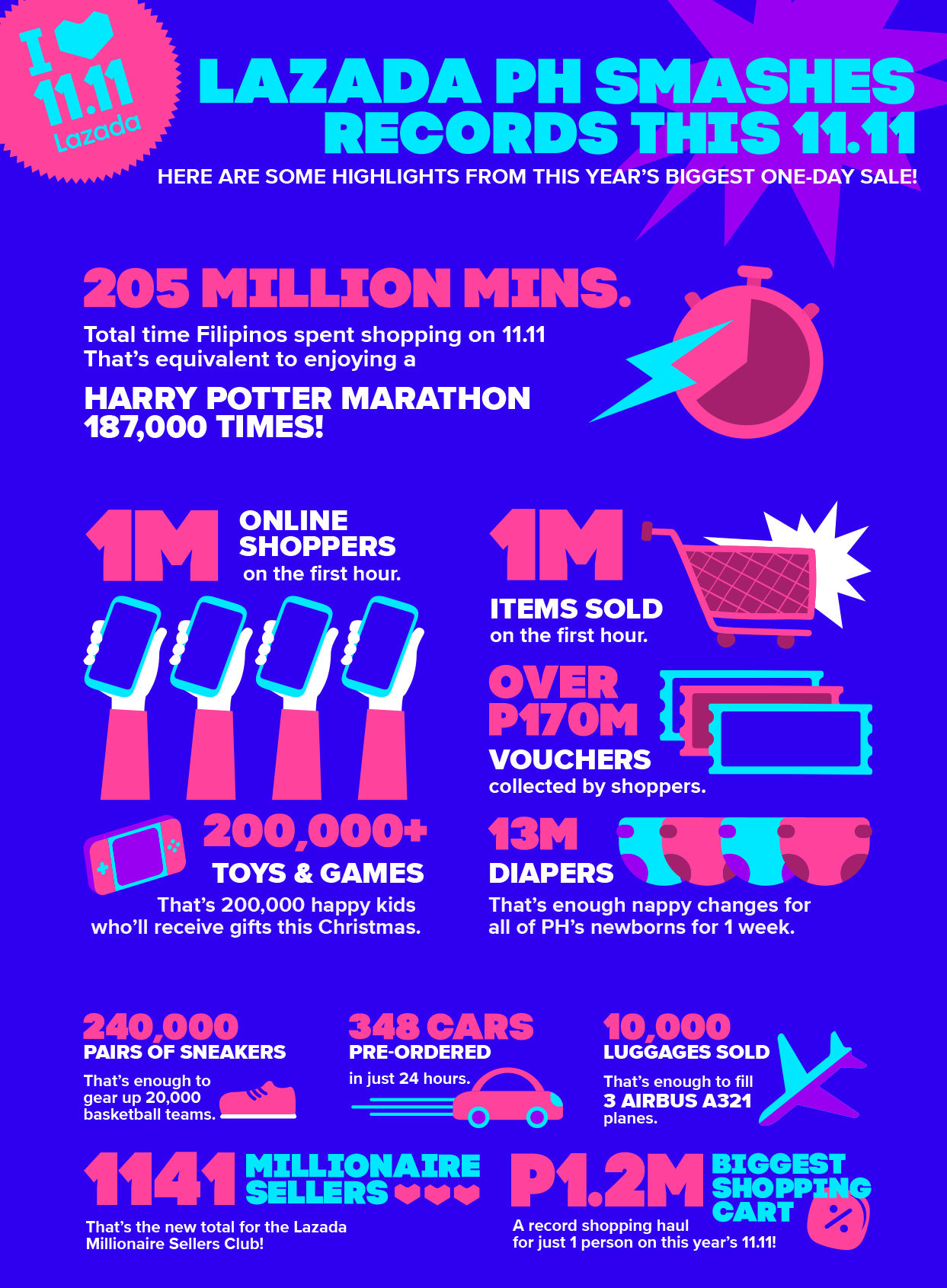 Filipinos went online starting midnight of 11 November to catch the massive discounts onthousands of local and international brands. During the first hour, 1 Million shoppers have joined the occasion and 1 Million items have been immediately sold. By the end of the day, the Lazada Millionaires Club, where sellers past the P1 Million sale mark earn membership, rose to a new total of 1,141 sellers.